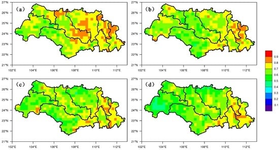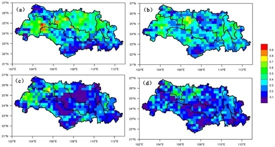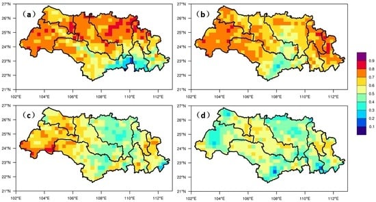 Study region maps showing the spatial distribution of correlation coefficient (R) in the Xijiang Basin. (a) 24 h lead time; (b) 48 h lead time; (c) 72 h lead time; (d) 96 h lead time.