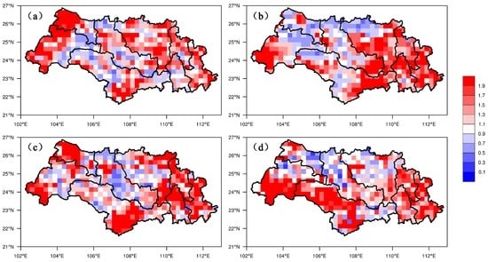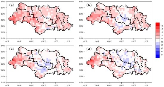 Study region maps showing the spatial distribution of Bias (≥0.1 mm/day) in the Xijiang Basin. (a) 24 h lead time; (b) 48 h lead time; (c) 72 h lead time; (d) 96 h lead time.