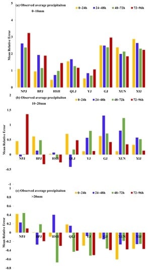 Mean relative error (MRE) of areal average forecast (yellow bars = 0–24 h; blue bars = 24–48 h; green bars = 48–72 h; red bars = 72–96 h) precipitation ((a) 0–10 mm; (b) 10–20 mm; (c) > 20 mm) for each sub-basin (BPJ = Beipanjiang; NPJ = Nanpanjiang; QLJ = Qianjiang–Liujiang; YJ = Yujiang; GJ = Guijiang; XUN = Xunjiang; XIJ = Xijiang).
