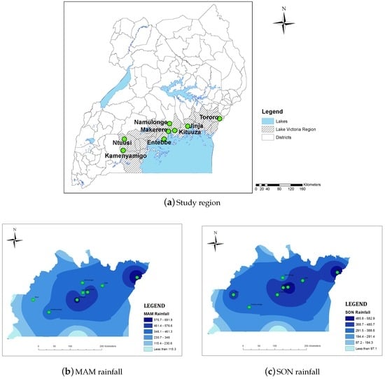 (a) The map of Uganda and the study region; (b) average Lake Victoria Basin (LVB) MAM seasonal rainfall; and (c) the average LVB SON seasonal rainfall.