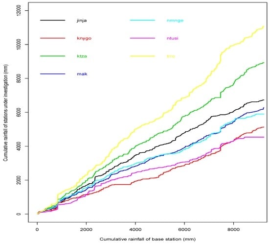 The rainfall data were tested for homogeneity using the double-mass curve (Figure 2) and found to be homogeneous. Tororo station experienced comparatively more rainfall than the other stations, which is illustrated by the its steep slope (i.e., the yellow line).