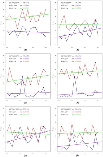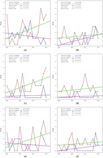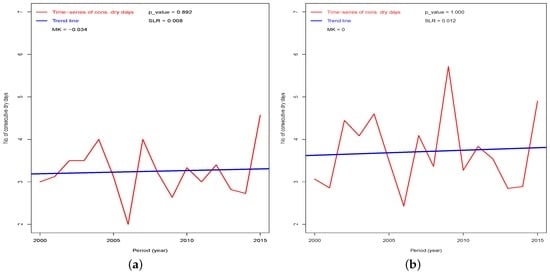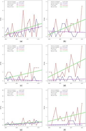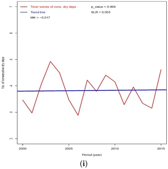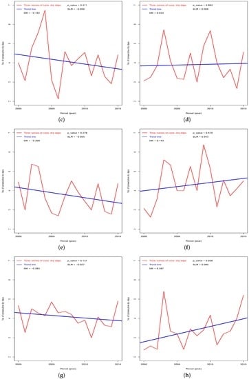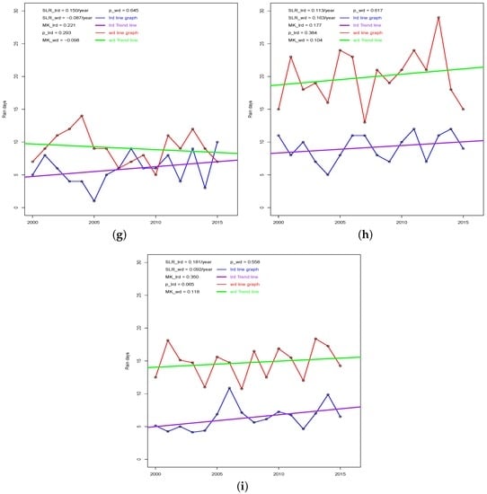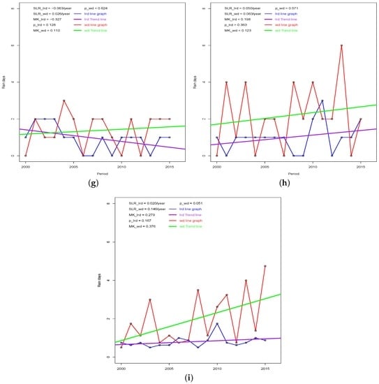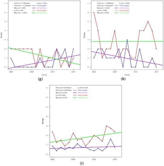 Linear regression is a simple method for determining the trends of time-series data []. Given an n time-ordered rainfall (rain days) dataset: }, ordered in time, t the simple linear regression is given as (A12):