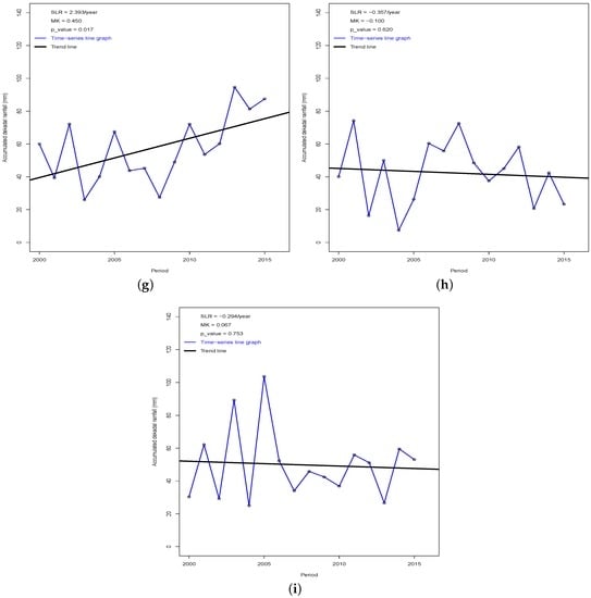 The figure is for accumulated dekadal rainfall averaged over the study locations. The vertical axis represents average dekadal rainfall for a given dekad, and we have used same scale for the ease of comparison. The rate of decrease/increase of the average dekadal rainfall; the Mann–Kendall trend along with its significant level is presented along with each subfigure (a–i). “dk” means dekad. (a) First dekad rainfall; (b) second dkrainfall; (c) third dk rainfall; (d) fourth dk rainfall; (e) fifth dk rainfall; (f) sixth dk rainfall; (g) seventh dk rainfall; (h) eighth dk rainfall; (i) ninth dk rainfall.