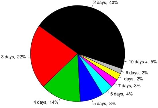The results for the trend of consecutive dry days during the MAM season of 2000–2015 are presented using Table 7 and Figure 7 and Figure 8. Table 7 shows the absolute number of consecutive dry days for each station over 2000–2015; Figure 7 shows the seasonal average number of consecutive dry days for each station per year; while Figure 8 shows the percentage number of the consecutive dry days over the study period. The results show that there was more frequent short dry spells with 2 days, 3 days and 4 days of consecutively no rain forming 40%, 22% and 14%, respectively (Figure 8). We noted that Jinja (: 0; : 0.012), Kituza (: 0.033; : 0.008), Namulonge (: 0.143; : 0.043) and Tororo (: 0.397; : 0.080) had increasing trends and that Tororo’s trend was increased significantly at 90%, and since we found that Tororo could have experienced more rainfall in Section 3.1, it could probably indicate an increased frequency of consecutive dry days with occasional heavy rainfall. The other stations had decreasing trends, and we also found a general non-significant decreasing trend (Figure 7i) on aggregating all of the stations (: −0.017; : 0.003 and p-value: 0.964). The increasing trend of consecutive dry days has implications for dry spells [] within a given season. The dry spells can result in meteorological drought whose effects can cascade, affecting agriculture and hydrology negatively.