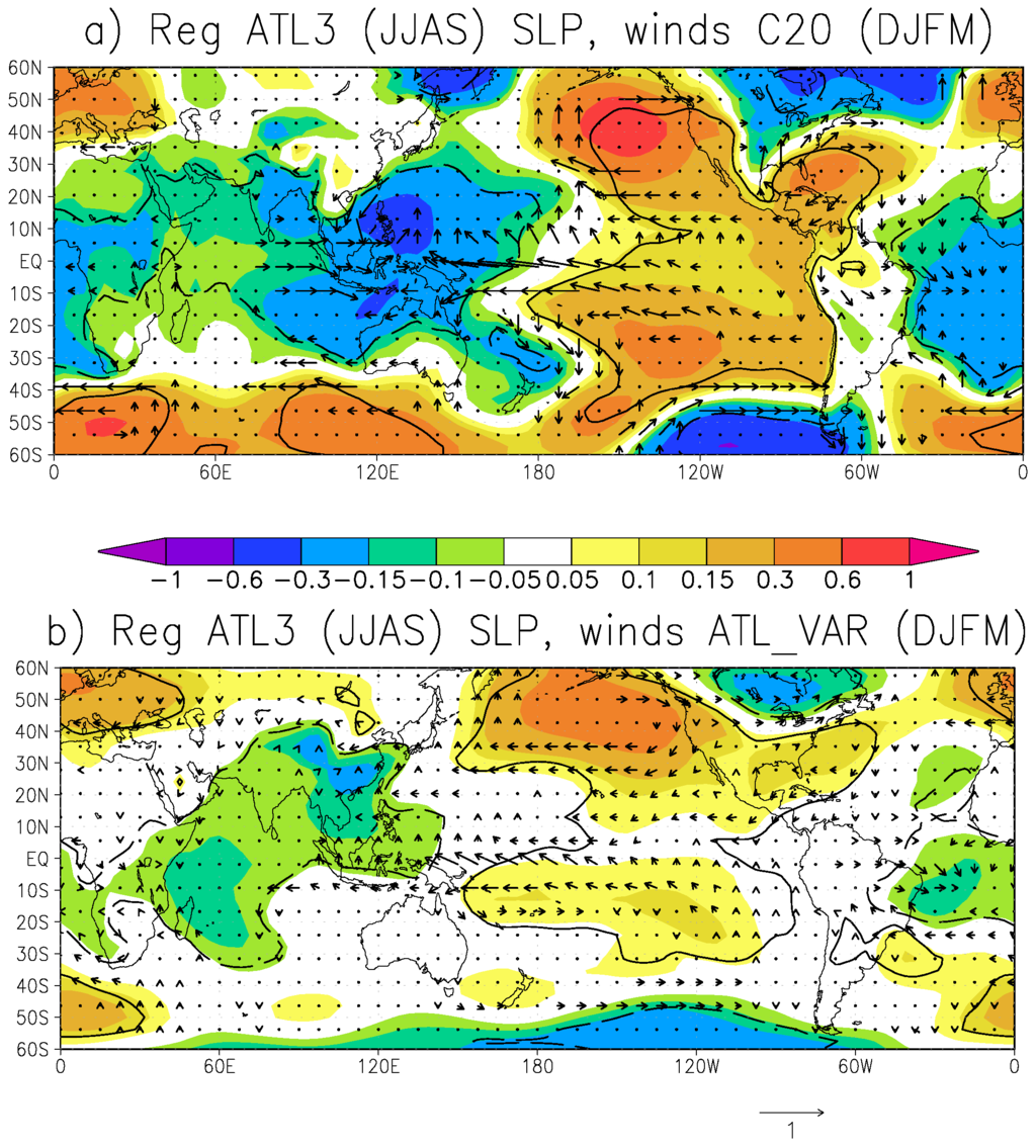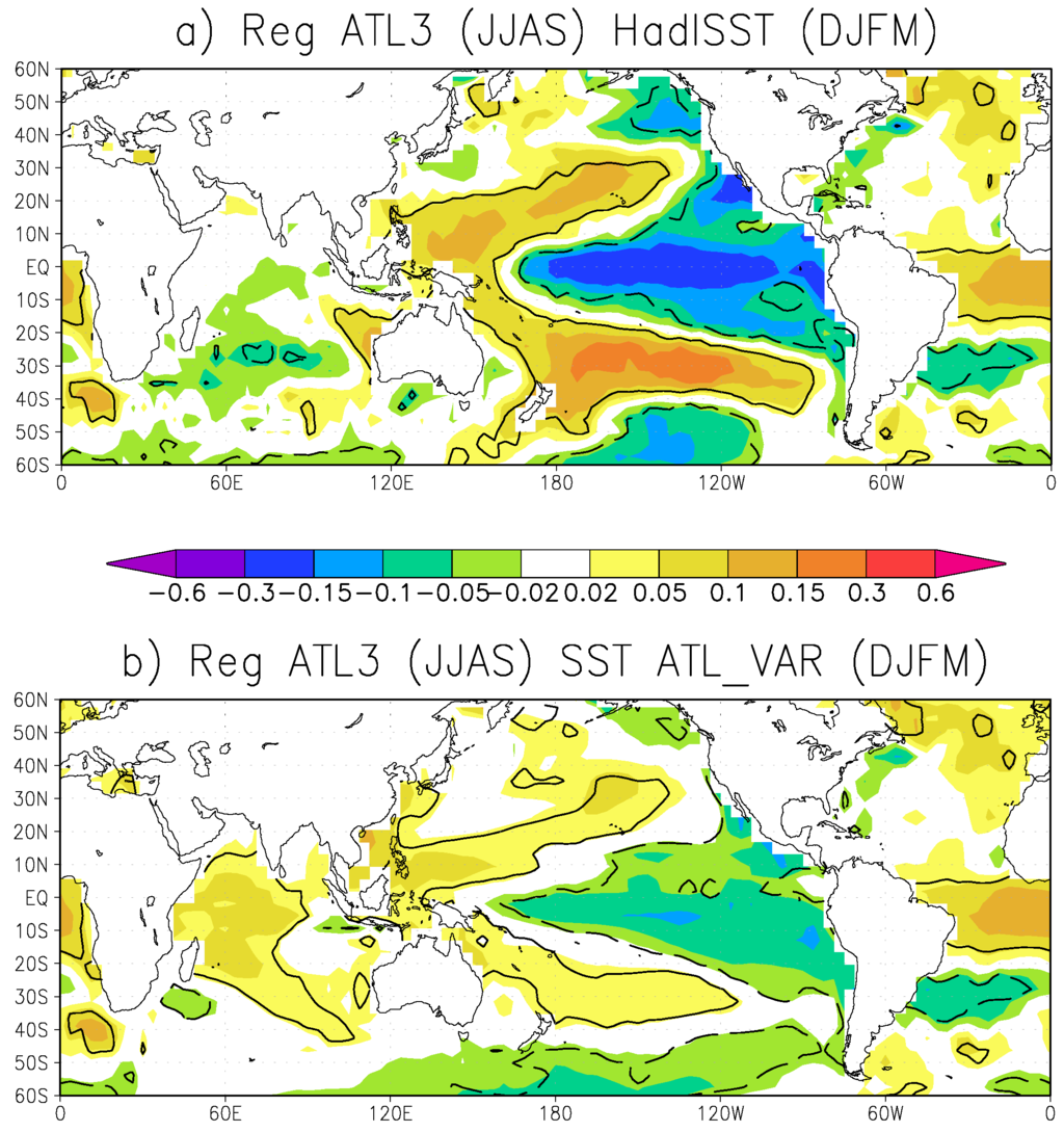 Figure 1 presents the regression of the June-to-September (JJAS) ATL3 index (defined as the SST anomalies averaged in the region (340E to 360E , 3S to 3N) onto the observed and ATL_VAR following December-to-March (DJFM) SST anomalies. An eastern Pacific equatorial cooling surrounded by a horse-shoe pattern of warmer SSTs in western tropical Pacific are associated with an equatorial Atlantic warming in both, the observational and modelled data (although with half of the magnitude in the model). Nevertheless, there is no agreement between observed and modeled anomalies in the Indian Ocean region.