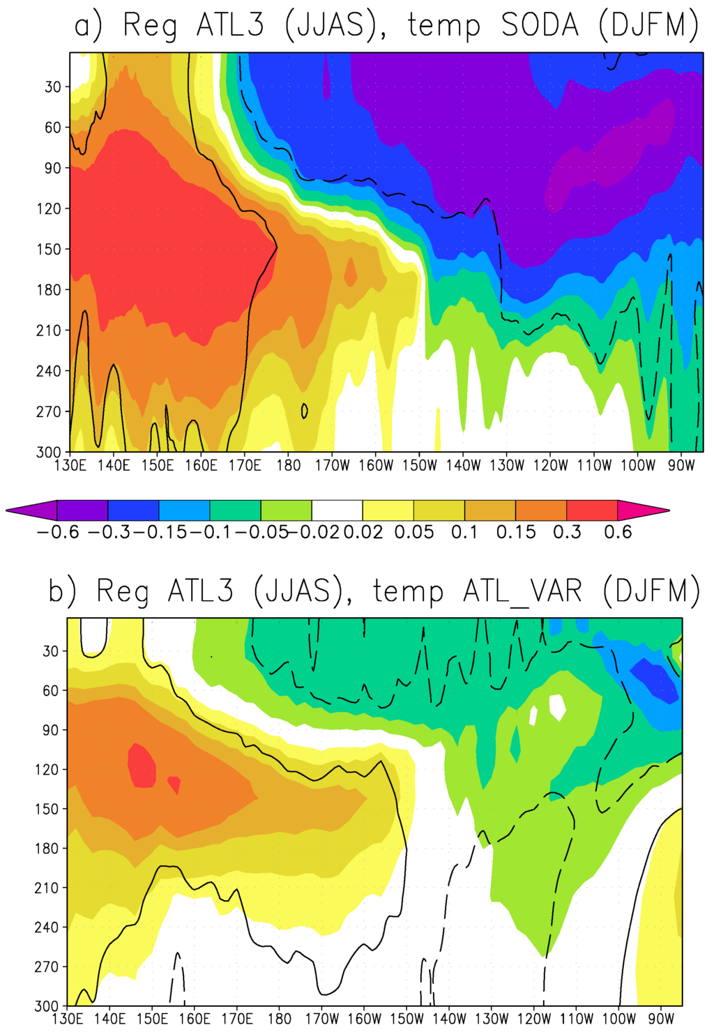 Regression of (a) observed; (b) ATL_VAR temperature near the equator (DJFM; averaged from 5S to 5N) onto the preceding (JJAS) ATL3 index. Anomalies that are 95% statistically significant are indicated by contours. Units are K.