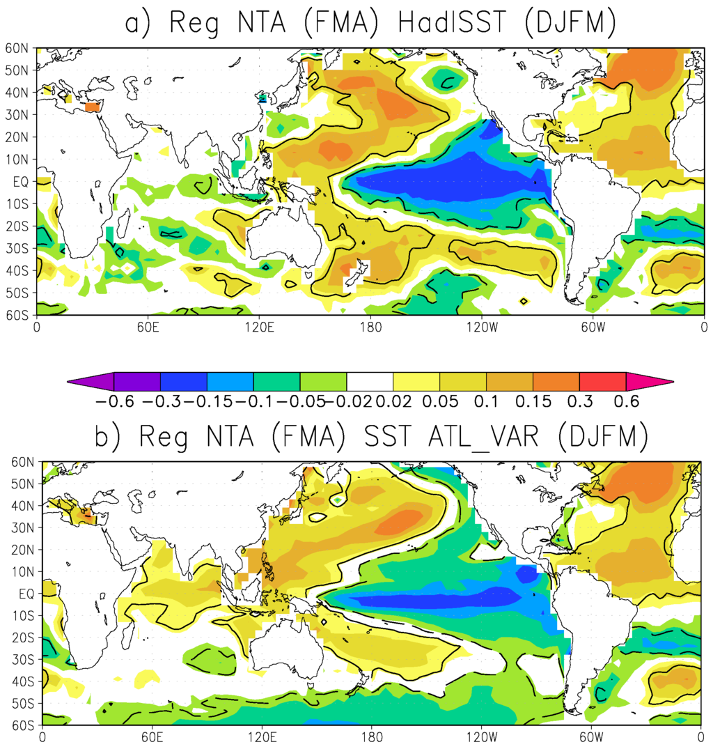 Regression of (a) observed and (b) ATL_VAR SSTs (DJFM) onto preceding (FMA) NTA index. Anomalies that are 95% statistically significant are indicated by contours. Units are K.
