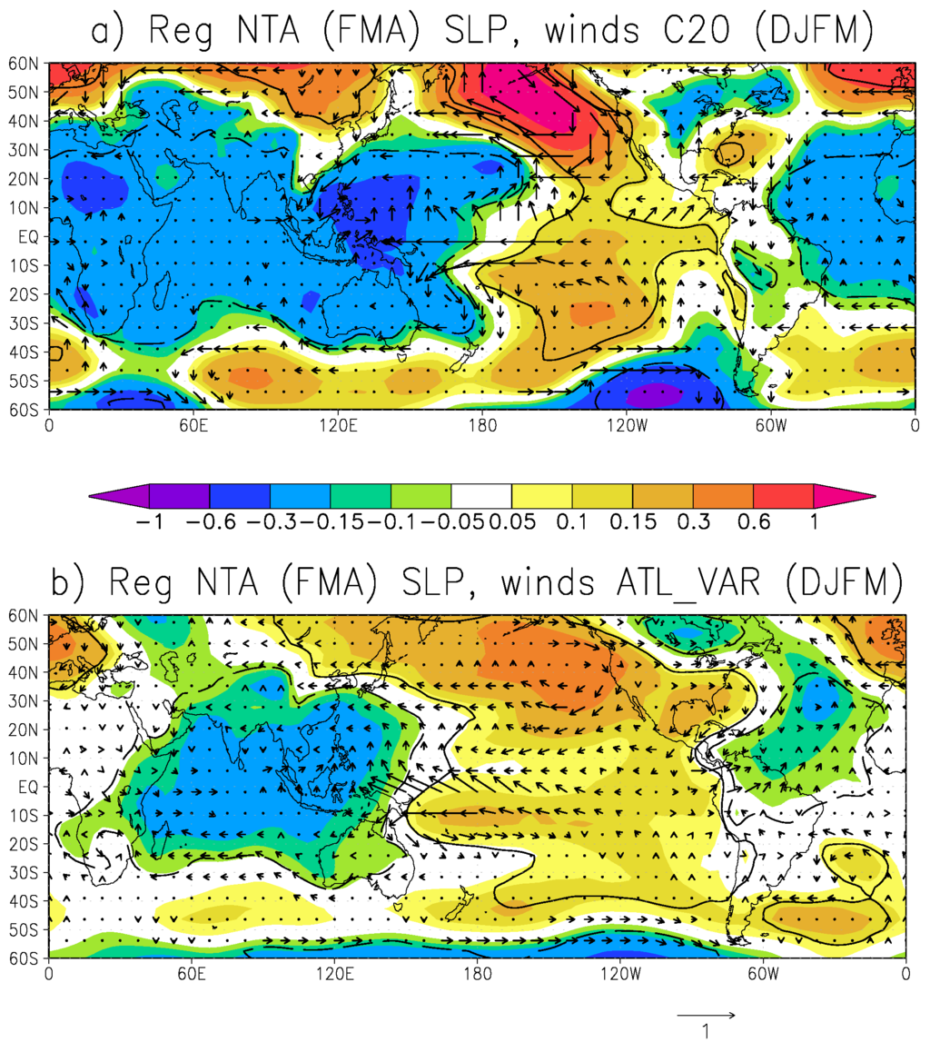 Regression of (a) observed and (b) ATL_VAR SLP and low-level winds (DJFM) onto preceeding (FMA) NTA index. SLP anomalies that are 95% statistically significant are indicated by contours, and only statistically significant wind vector components are shown. Units are hPa for SLP and m/s for winds.