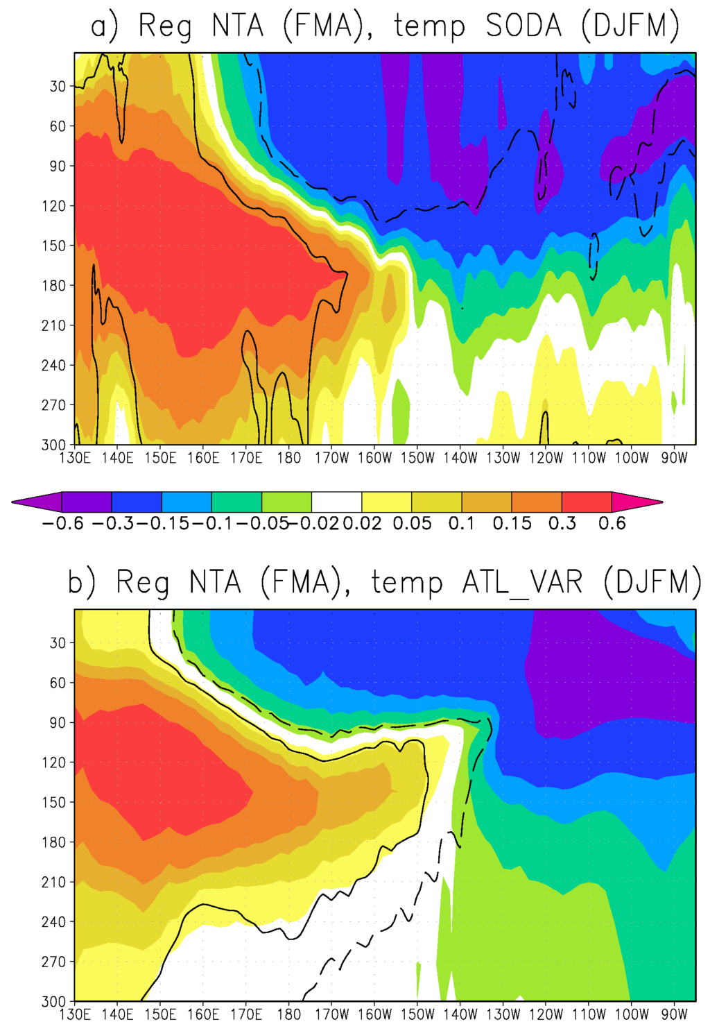 Regression of (a) observed; (b) ATL_VAR temperature near the equator (DJFM; averaged from 5S to 5N) onto the preceding (FMA) NTA index. Anomalies that are 95% statistically significant are indicated by contours. Units are K.