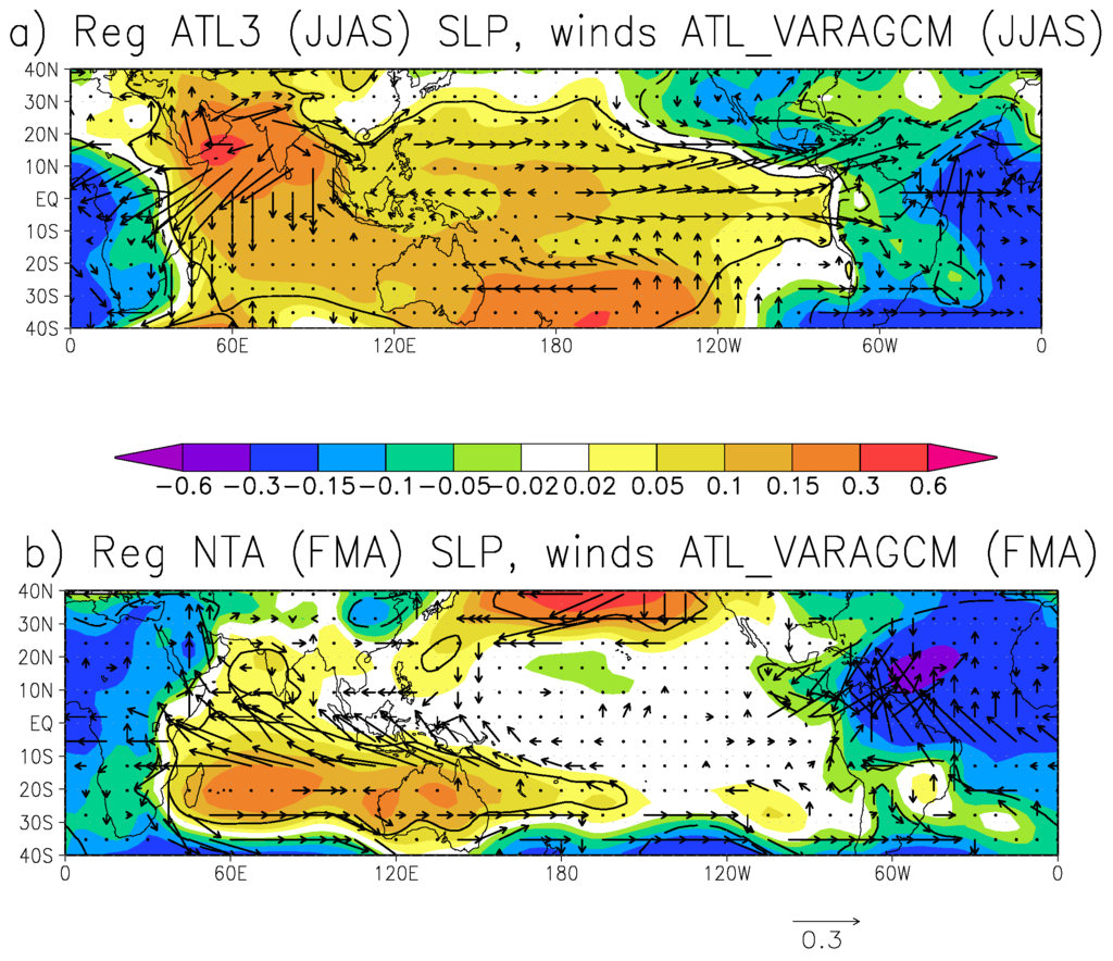 The strong equatorial westerly anomalies in response to ATL3 which are absent in the response to NTA SST anomalies may explain why in the coupled ATL_VAR simulations the response to the ATL3 is weaker compared to the NTA. These differences in the instantaneous ATL_VARAGCM responses to ATL3 and NTA depend also on the fact that these indices are defined in different seasons. For example, the response to ATL3 in JJAS shows substantial anomalies in the Indian Ocean region north of the equator in correspondence with the boreal monsoon, whereas the response to NTA in FMA is strongest south of the equator in the Indian Ocean. Such responses could be model dependent, and therefore further research is needed to investigate such model dependencies.