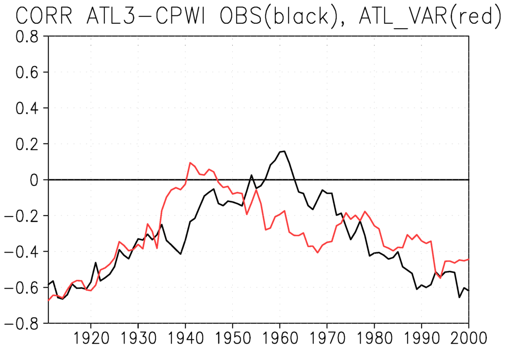 Figure 9 shows the 21-years running correlations between the ATL3 index and an equatorial central Pacific wind-stress index (CPWI) as in [22] averaged over the region 160E to 190E, 5S to 5N for observations (black curve) and ATL_VAR (red curve). Overall, the correlations for the whole period (1901 to 2010) are negative, as expected from the mechanism identified in the previous sections (–0.35 for observations and –0.36 for ATL_VAR, both statistically significant at the 95% confidence level). However, as suggested by [4,10,11], there are strong decadal variations in both the observations and ATL_VAR. In addition, both observations and ATL_VAR show strongest correlations at the beginning and the end of the 20th century, and overall weaker correlations in the middle of the century, although the phasing is somewhat different between observations and the model. Overall, the results from this analysis are consistent with the recent work by [4,10,11].