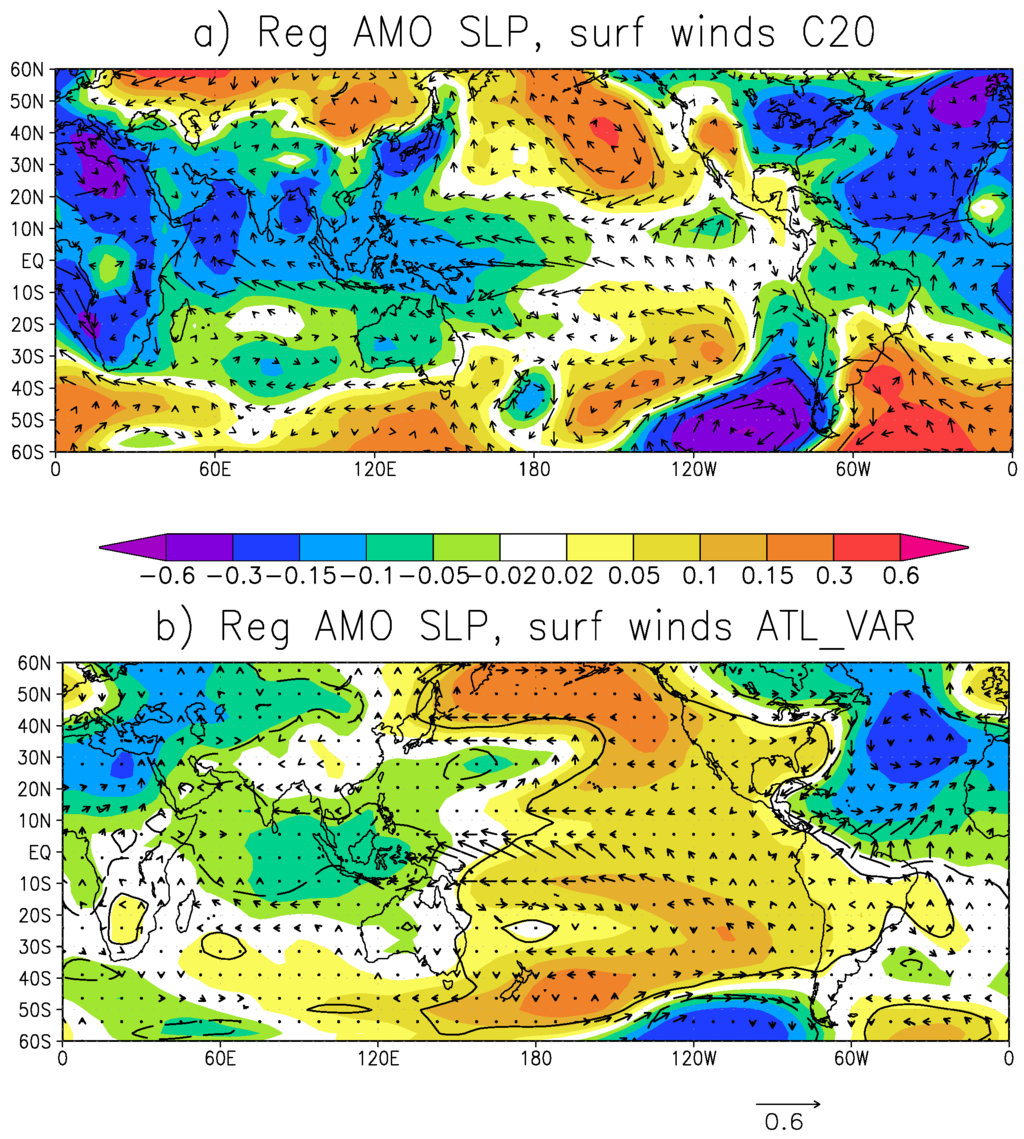 Regression of (a) observed and b) ATL_VAR SLP and low-level winds onto preceding AMO index. In (b), SLP anomalies that are 95% statistically significant are indicated by contours, and only statistically significant wind vector components are shown. Units are hPa for SLP and m/s for winds.