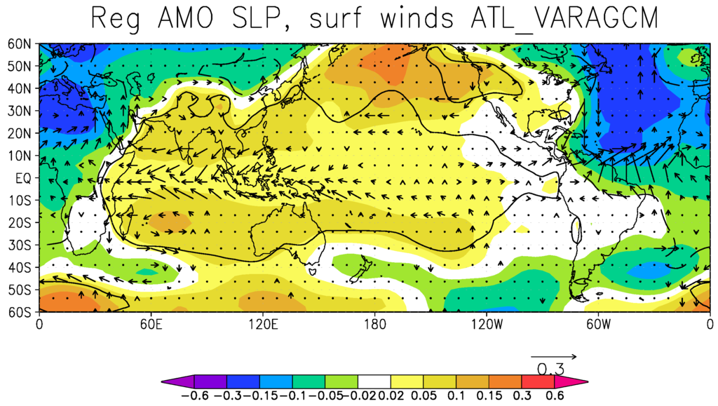 In [22], a very similar analysis has been presented but without removing the global mean. The results are nevertheless very similar to those presented in [22]. A positive AMO leads to a cooling and higher SLP in the eastern Pacific compared to the western Pacific as well as to a warming and decreased SLP in the other tropical Indo-Pacific regions. In addition, the observed easterly low-level wind anomalies in the central-eastern Pacific are reproduced by experiment ATL_VAR.