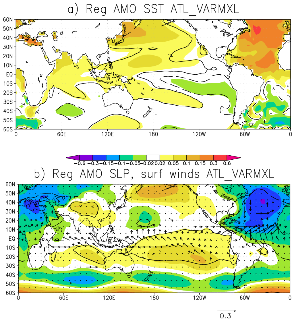 Response of ATL_VARMXL on (a) SST and (b) SLP and low-level winds to AMO forcing. SST and SLP anomalies that are 95% statistically significant are indicated by contours, and only statistically significant wind vector components are shown. Units are K for SST, hPa for SLP and m/s for winds.