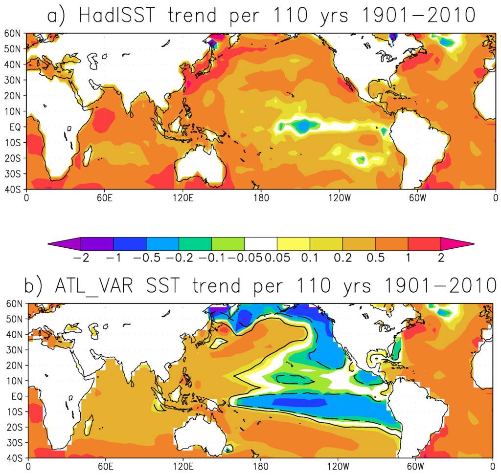For the centennial analysis, the trend is analyzed, keeping in mind that in the model only the impact of the Atlantic SSTs on the Pacific can be reproduced, but not the direct effect of the CO forcing in the Indo-Pacific region. Based on the data availability, the common time for analysis chosen is 1901 to 2010.