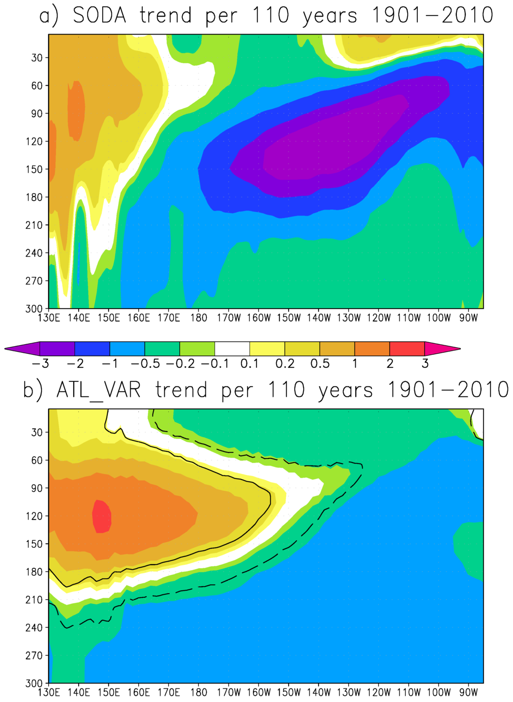Linear trend of temperature near the equator (averaged from 5S to 5N) for the period 1901 to 2010 per 110 years for (a) observed and (b) ATL_VAR. In (b), anomalies that are 95% statistically significant are indicated by contours. Units are K.