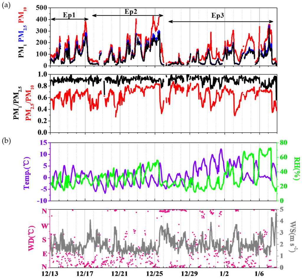 Time series of (a) mass concentration of PM1, PM2.5, PM10, and the ratio of PM1/PM2.5, PM2.5/PM10; (b) meteorological variables (wind direction, wind speed, relative humidity, and temperature).