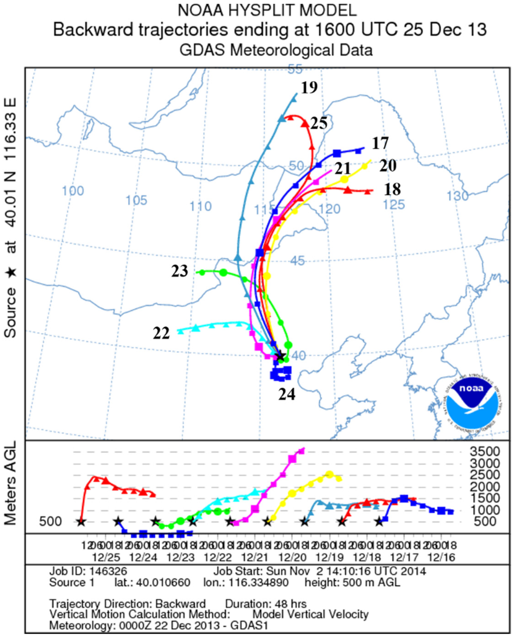 Back trajectories for the sawtooth of 17–25 December 2013. Numbers denote date of arrival of the air at Beijing. Calculations begin at 500 m above ground and continue for 48 h.