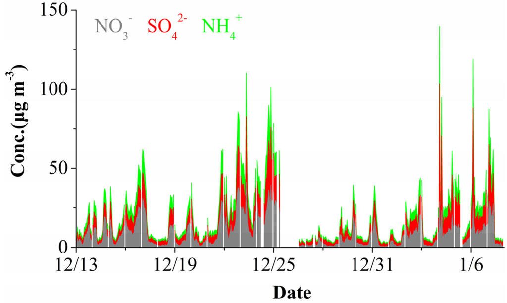 Online ambient observation was conducted from 13 December 2013 to 7 January 2014 at the Tsinghua University campus (40°00′17′′N, 116°19′34′′E) in Beijing, which is located about 20 km northwest of the city center and about 1 km north of the Fourth Ring road. The sampling site is situated on the roof of a third-story building, approximately 10 m above ground. No major pollution sources are nearby. All the data are hourly unified and reported at ambient temperature and pressure conditions in Beijing Standard Time.