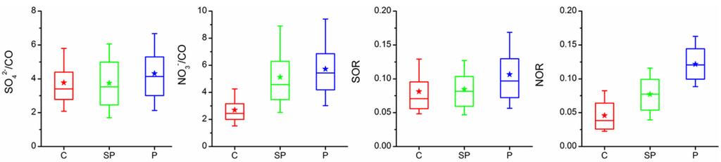 Variation of SO42−/CO, NO3−/CO, SOR, and NOR with pollution level. The “C”, “SP”, and “P” in the figure refer to “clean”, “slightly polluted”, and “polluted” respectively. The mean (pentagram), median (horizontal line), 25th and 75th percentiles (lower and upper box), and 10th and 90th percentiles (lower and upper whiskers) are shown for each bin.