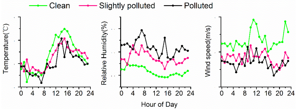 Meteorological conditions have a strong impact on pollution level. Compared to clean periods, polluted periods are characterized with lower temperature, higher relative humidity, and lower wind speed (Figure 5). The relatively low temperature and wind speed would favor the accumulation of chemical pollutants. The high relative humidity in polluted episodes would accelerate the formation of sulfate and nitrate through the oxidation of SO2 and NO2 in aqueous phase. This is further proved by the strong correlation of sulfate and nitrate with relative humidity (r = 0.65 and 0.56 respectively).