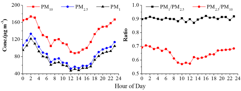 The ratio of PM1/PM2.5 does not show obvious hourly variations during the entire study. The values remain high (~0.90) the whole day. However, the ratio of PM2.5/PM10 shows apparent low values in the morning (8:00~12:00). This may be a consequence of the re-suspension of coarse road dust and construction fugitive dust. Enhanced human activities would contribute lots of coarse particles (aerodynamic diameter from 2.5 μm to 10 μm) during daytime. However, after noon, intense photochemical reactions would promote the secondary formation of fine particles.