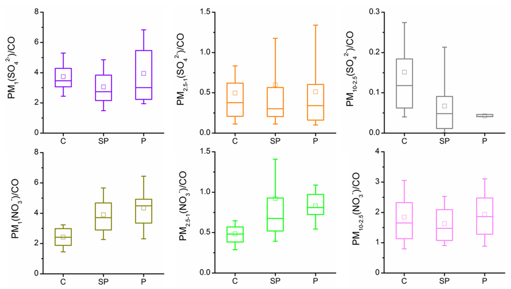 Variation of sulfate and nitrate concentrations in PM1, PM2.5–1 and PM10–2.5 with pollution level. The mean (square), median (horizontal line), 25th and 75th percentiles (lower and upper box), and 10th and 90th percentiles (lower and upper whiskers) are shown for each bin.