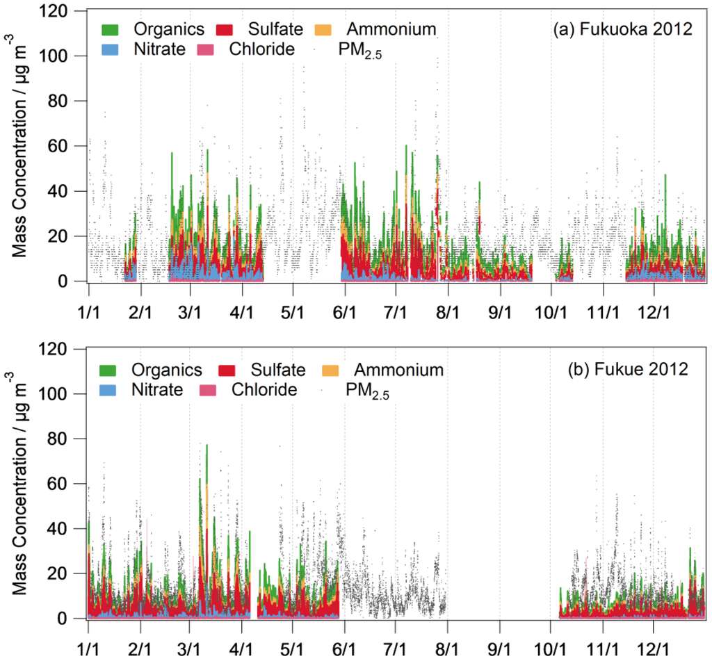 Figure 2a,b shows variations in the PM mass concentrations and chemical composition measured in Fukuoka City and Fukue Island. Monthly averages of each of these values is listed in Table 1. For Fukuoka, there are several periods when data were missing due to the Q-AMS pump trouble. Because the main focus was on trans-boundary air pollution from mainland China, data for Fukue Island were measured only from January to May and then from October to December to correspond to the pollution’s winter-spring season. Total mass concentrations of chemical components (stack on graph) show a similar variation with that of PM2.5 mass concentrations. While sulfate and organics are major components in both sites, nitrate is more significant in Fukuoka City than that on Fukue Island. High PM2.5 and sulfate events were observed several times in both sites in spring and summer.