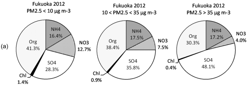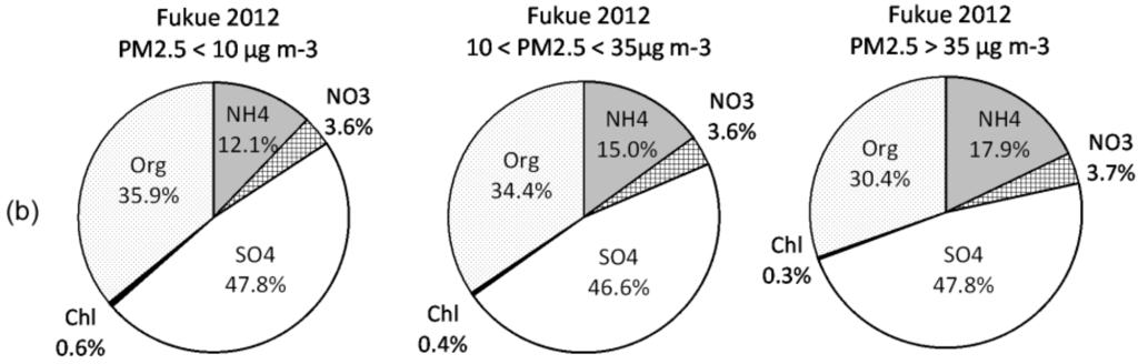 Figure 3a,b show the breakdown of the chemical composition of PM measured in Fukuoka City and Fukue Island under high (>35 µg·m−3), middle (10–35 µg·m−3), and low (<10 µg·m−3) PM2.5 mass concentrations for 2012. On Fukue Island, sulfate accounted for approximately 50%, which is the largest fraction of total PM, and nitrate was minor in every case. The fraction of each chemical component did not change with PM2.5 mass variation. In contrast, in the case of high PM2.5 concentrations in Fukuoka City during the observation period, sulfate accounted for the largest fraction of total PM measured by Q-AMS for the event of highest PM2.5 concentration, while organics and nitrate made up a large fraction under low PM2.5 concentrations. High levels of sulfate within high PM2.5 concentrations are similar to the results for Fukue Island.