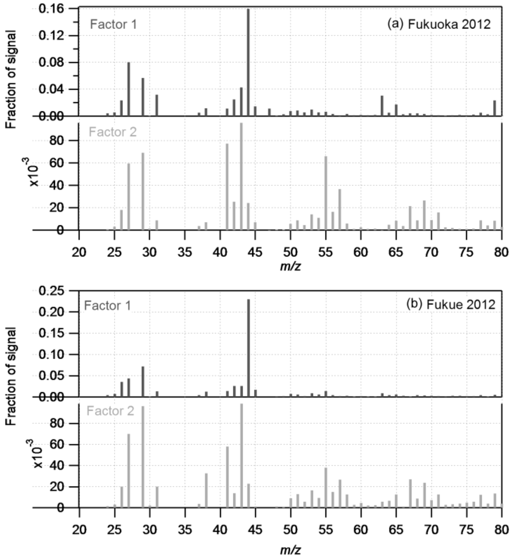 Mass spectra of each factor produced by the PMF analysis. (a) Fukuoka City (b) Fukue Island.