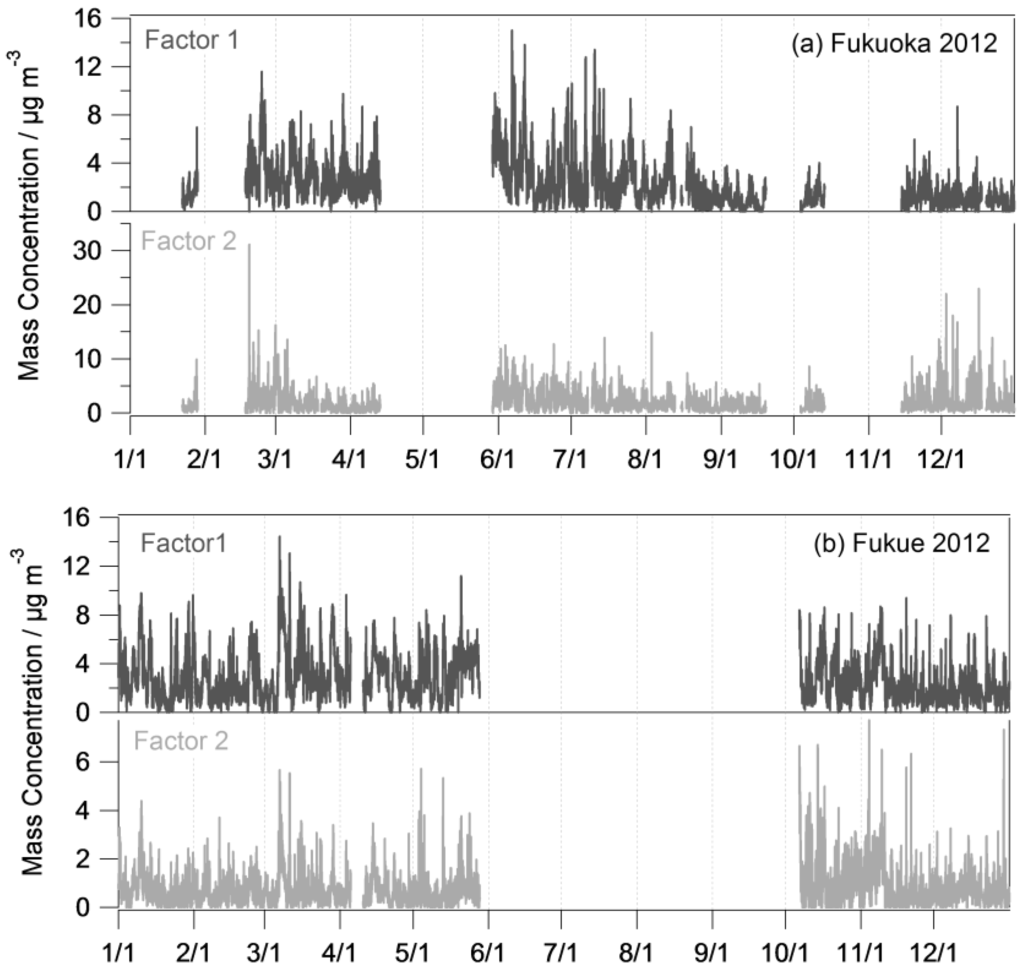 Variations of mass concentration of each factor produced by the PMF analysis. (a) Fukuoka City; (b) Fukue Island.