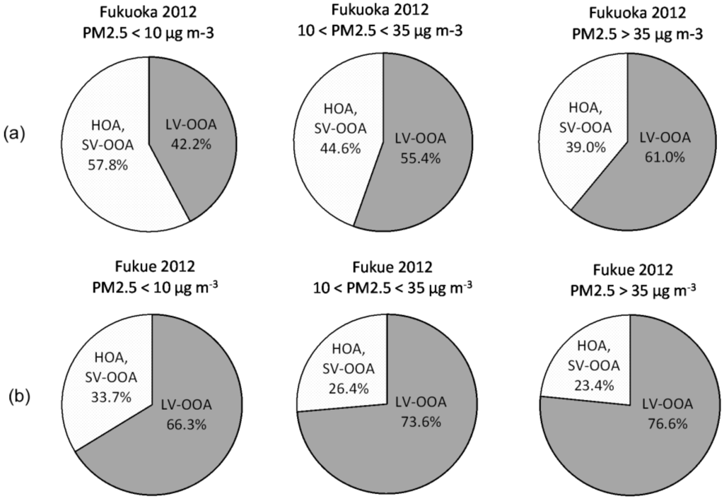 In Fukuoka City, the results are different from those observed on Fukue Island. The chemical composition varies according to PM2.5 concentrations. High sulfate levels were observed under high PM2.5 concentrations. In this case, factor 1 (LV-OOA) in the PMF analysis is dominant. Under low PM2.5 concentrations, however, nitrate and organic fractions are more prevalent. In addition, factor 2 (SV-OOA and HOA) in the PMF analysis is larger than factor 1 (LV-OOA).