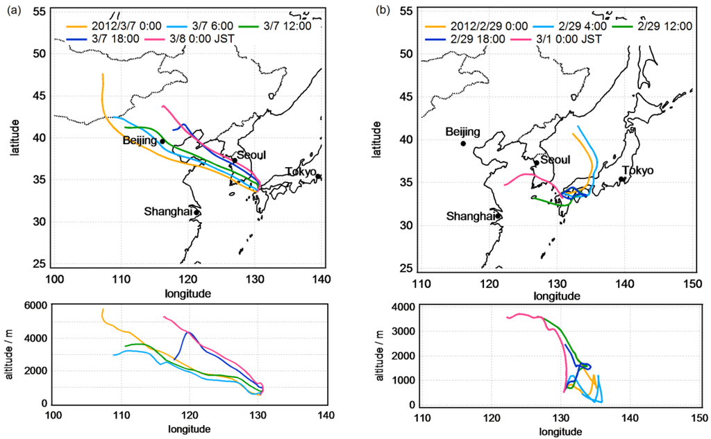 Typical backward trajectory calculations in Fukuoka City. Duration time of the calculations was 48 h. (a) under high PM2.5 concentrations (7 March 2012, daily average of PM2.5 was 41 µg·m−3); (b) under low PM2.5 concentrations (29 February 2012, daily average of PM2.5 was 6.0 µg·m−3).