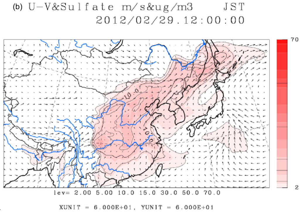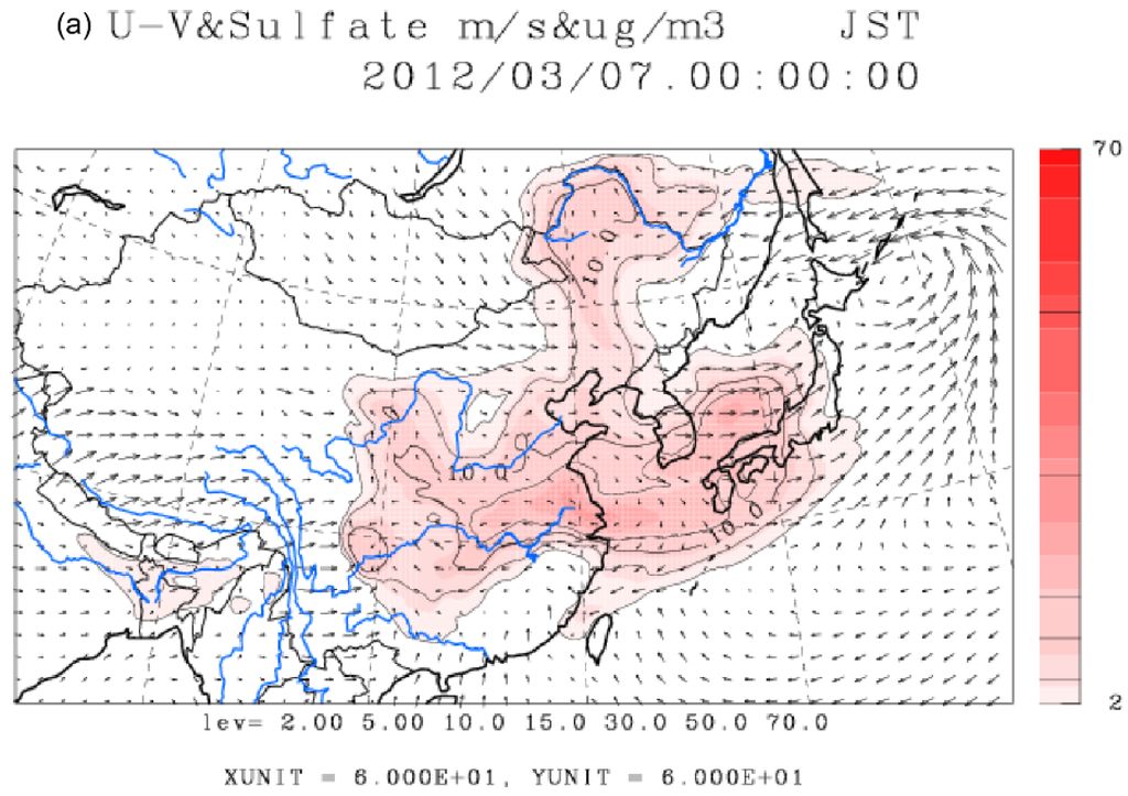 Typical CFORS simulations around East Asia. (a) under high PM2.5 concentrations (7 March 2012); (b) under low PM2.5 concentrations (29 February 2012).