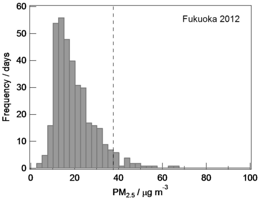 Figure 9 shows the frequency of daily PM2.5 mass concentrations throughout 2012 for Fukuoka. There were a total of 20 days when PM2.5 mass concentrations exceeded environmental quality standard (>35 µg·m−3), which are 5.5% per year and 11% in spring time (10 days between March–May). The air quality in Fukuoka, which is in the western part of Japan, is largely affected by trans-boundary, long-range transported air pollution from mainland China.