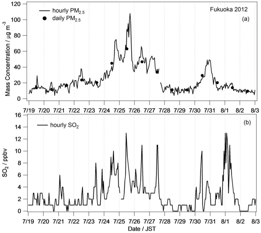 Air pollution emissions from East Asia have increased in recent years in connection to rapid economic growth. Kurokawa et al. [1] reported that emission of air pollutants in East Asia significantly increased from 2000 to 2008. These air pollutants mainly consist of sulfur dioxide (SO2), nitrogen oxides (NOx), carbon monoxide (CO), volatile organic compounds (VOCs), and their emissions in 2008 (growth rate between from 2000 to 2008) were increasing 56.9 Tg (+34%), 53.9 Tg (+54%), 359.5 Tg (+34%), and 68.5 Tg (+46%), respectively. China contributed to the Asian emissions for largest fraction in Asian countries because of continuous increase in its energy consumption, and their emissions of each species are 33.5 Tg (+46%), 27.0 Tg (89%), 202.0 Tg (+42%), and 27.1 Tg (+71%), respectively [1]. It is reported that SO2 emissions in China decreased after 2006 [2]; however, emissions of these air pollutants in China still increased monotonically [1]. It is well known that these air pollutants are transported throughout the continent from China to Japan with seasonal monsoons in winter and spring [3,4,5,6,7,8,9]. Many recent studies reported that atmospheric aerosol was transported from mainland China to the northern part of the Kyushu area and Okinawa, which face the East China Sea in Japan [3,4,5,6,7,8,9]. In these studies, high concentrations of particulate matter (PM2.5), which were noted to be over environmental quality standards in Japan for 24 h of 35 µg·m−3, were observed. We observed chemical composition of atmospheric aerosol by using an aerosol mass spectrometer and a filter sampling method at Cape Hedo in Okinawa, and on Fukue Island, Nagasaki, in Japan in previous studies. Both sites are located on the windward side of the seasonal monsoons in winter and spring. High concentrations of sulfate were observed when the air mass was transported from mainland China to these sites [3,4,8,9,10,11,12].These high values were considered to be due to trans-boundary air pollution [3,4,8,9,10,11,12]. It is, therefore, important to understand the transport of air pollutants including PM.