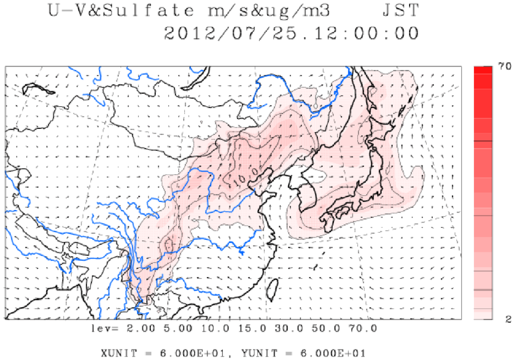 It was considered that trans-boundary air pollution was often observed in the winter-spring season. In 2012, high PM2.5 concentrations were observed during summer time. There were several days when the daily PM2.5 concentrations were over 35 µg·m−3. Figure 10a shows hourly and daily averaged PM2.5 concentrations from 19 July to 2 August. The maximum daily PM2.5 concentration was 63.1 µg·m−3 on 25 July. That day, a high PM2.5 concentration was also observed in Osaka [29]. The chemical and organic compositions are shown in Figure 11. The fraction of sulfate and factor 1 (LV-OOA) is about 50% and 60%, respectively. There are several reasons for this high sulfate event. The first one is volcanic activities. There is an active volcano called Mt. Sakurajima in Kagoshima, which is about 300 km south to Fukuoka City (31.34°N, 130.39°E). Explosive eruption have been occurring continuously since 1955. Mt. Sakurajima was active in summer 2012 and volcanic eruption occurred several times. During the high PM2.5 period shown in Figure 10b, high concentration peaks of SO2, measured at Fukuoka City Hall, were observed several times. The biggest eruption occurred at 19:15 on 24 July [30], and high sulfate and SO2 were observed on 25 July. Therefore, one of the reasons can be attributed to the volcanic activities. The second reason is photochemical reaction in the atmosphere. The fraction of factor 1 (LV-OOA) is about 60%, which is not as high as that on Fukue Island during winter-spring season and similar to the average values of urban OOA [31]. Therefore, the aged and oxygenated organic compounds in urban area certainly contributed the factor 1 (LV-OOA). The third one is trans-boundary air pollution. The CFORS simulation for 25 July shows that the high sulfate area covers the northern Kyushu region shown in Figure 12. The high sulfate area originally covered in the mainland China on 20 July, and the area moved to the northern part of China and the Korean peninsula. Then, a part of high sulfate area moved down to the southern area and covered some part of Japan. A simulation called SPRINTARS also shows that the high sulfate region averaged in July 2012 covered the northern part of Kyushu and the west Japanese region facing the Japan Sea [29]. This high sulfate region moved from China to Japan during this high PM2.5 concentration period (from 20 to 28 July). Although we do not know if summer levels in 2012 were unique, this high PM2.5 concentration event shows that trans-boundary air pollution occurs not only in winter-spring but also in summer and plays a significant role in air quality for Fukuoka City.