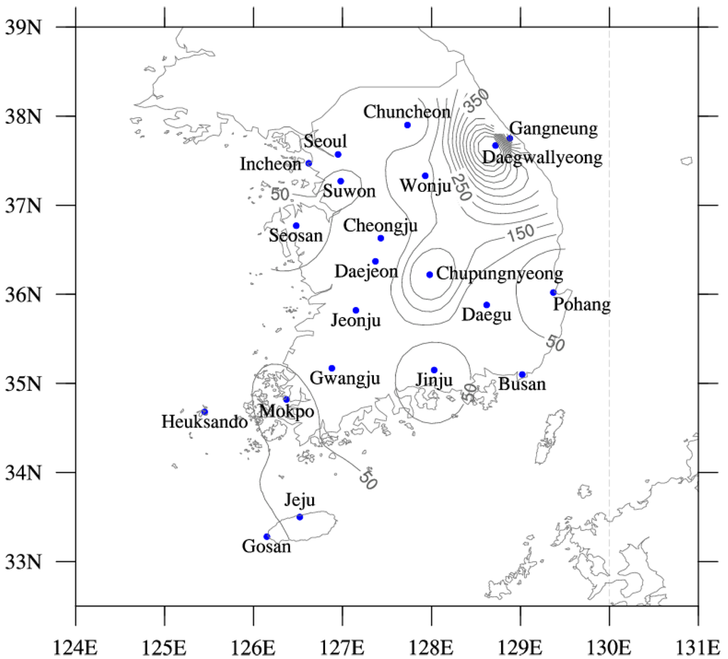 The Korean Meteorological Administration (KMA) maintains 21 solar radiation measurement stations (Figure 1). The Gangneung site was established in January 2008, later than other sites. The KMA database provides hourly broadband global solar irradiance measurements. In this study, the daily irradiance data are used together with corresponding meteorological parameters measured at synoptic stations maintained by KMA over 15 years from January 2000 to December 2014 for all but one site (Gangneung). These sites are part of the World Meteorological Organization (WMO) network.
