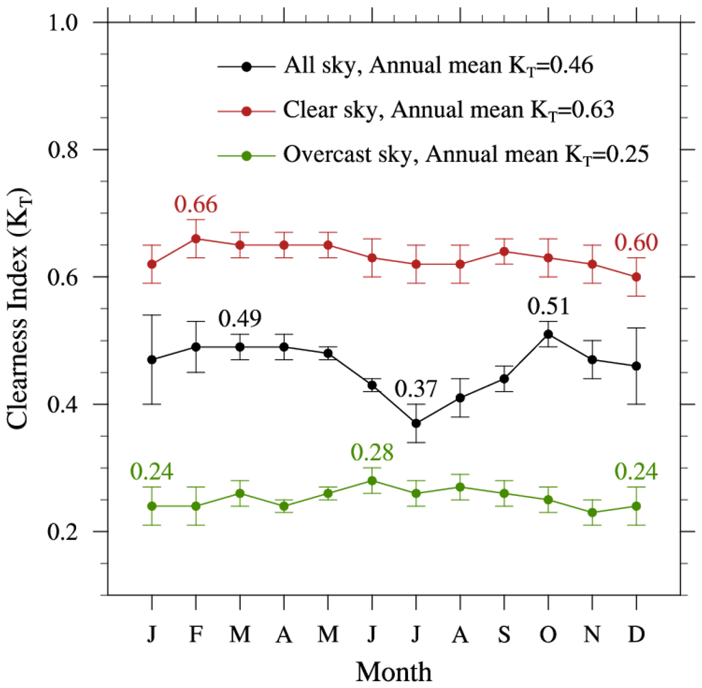 To quantify the extinction of solar radiation in the atmosphere, the combined contributions of various atmospheric parameters that affect incoming solar radiation need to be examined. While these extinction processes are complex, the estimation of sky conditions using incident solar radiation at a given location has been proposed as a simple approach. The ratio of the global solar radiation measured at the surface to the extraterrestrial solar radiation is defined as the clearness index (KT) [4,5,6,7,8]. The clearness index has been used as a general indicator of the combined effects of the various extinction processes, which determine the transmission of solar radiation through the atmosphere.