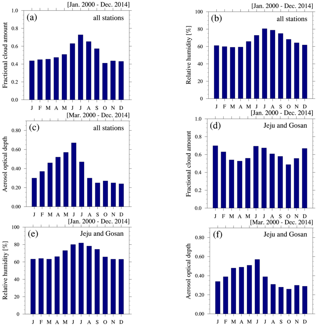 The general pattern of monthly average KT values over the 21 sites is not the same for all regions, particularly Jeju Island located in the South Sea, southwest of the Korean Peninsula. Minima of 0.29 in January and 0.33 in December/January are observed at Jeju and Gosan, respectively (Table 1). To explain this difference, the monthly distributions of CA, RH, and AOD for the Jeju and Gosan sites are presented in Figure 3d–f. Interestingly, the temporal variations in CA over Jeju Island are quite different to those at other sites (Figure 3a,d), while variations in RH and AOD are similar at all sites. For Jeju and Gosan, a relatively high CA occurs in December and January, indicating a different climate pattern between the mainland and the island. The decrease in KT over Jeju Island in December and January can be attributed to frequent overcast skies, due to the combined effects of strong northwest prevailing winds in winter and a geographical location adjacent to the sea. These results indicate that the monthly variations in KT are closely related to variations in cloudiness at the respective sites. The contribution of CA to KT variations is discussed further in Section 3.4. In addition, Ogunjobi et al. [9] analyzed the characteristics of KT using global solar radiation data for the period 1998–2000 at only two sites, Gwangju and Seoul, with similar results to this study.