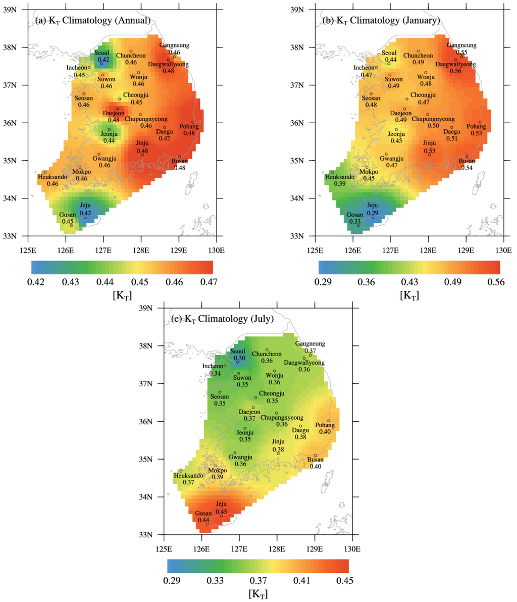 Spatial distributions of KT climatology in Korea: (a) annual; (b) January; and (c) July.