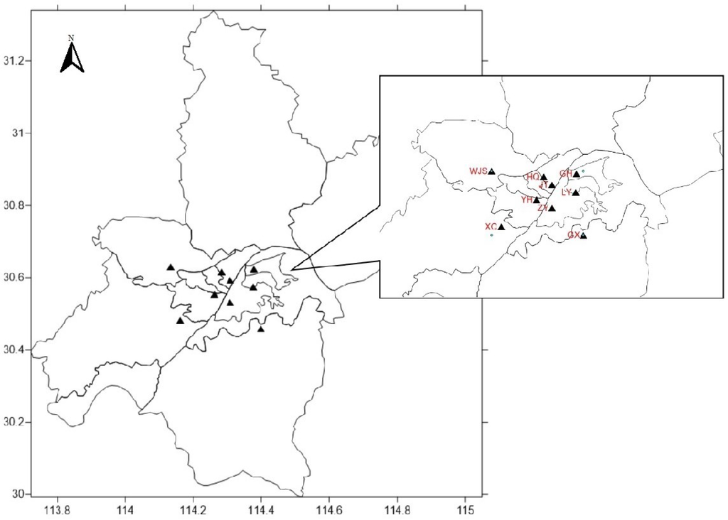 The study area is Wuhan (Longitude 113°41’E–115°05′E, Latitude 29°58′N–31°22′N), the capital city of Hubei province. It is situated on the east of the Jiang-Han plain, a vast area in the valley of the Yangtze River. Wuhan covers an area of around 8494 km2 and has a subtropical moist monsoon climate with four distinct seasons. Currently, there are nine air quality monitoring stations in operation in urban Wuhan (Figure 1), with concentrations of criteria pollutants such as PM2.5, PM10, NO2, O3, CO, and SO2 being routinely recorded. However, PM2.5 has been monitored only since 2013.