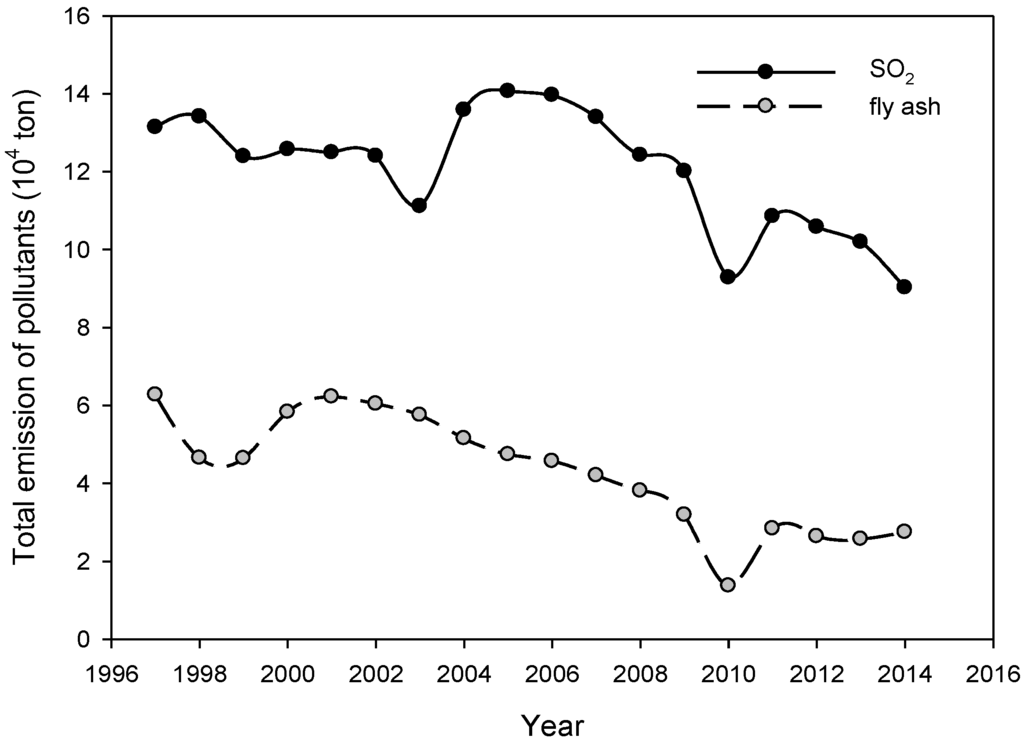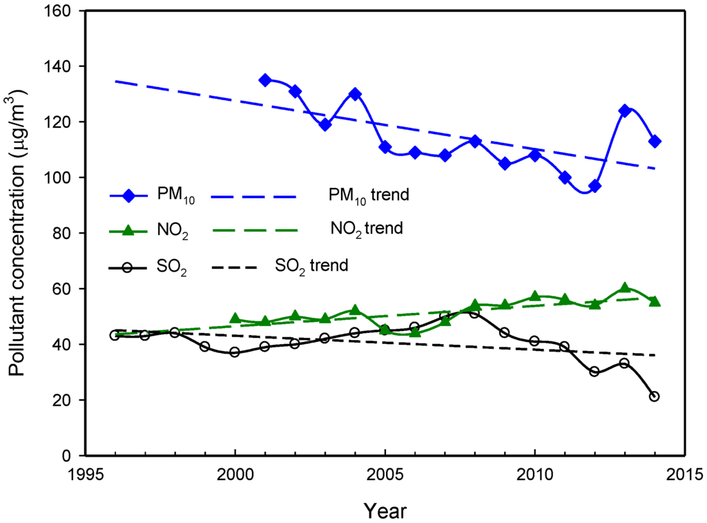 The annual variation for the NO2 concentration is not as significant as PM10 and SO2 (Figure 2). However, the Mann-Kendall test indicates a strong increasing trend at the 0.01 significance level and Sen’s method gives a positive slope of 0.67 µg/m3 per year. Further, the NO2 concentrations exceeded the class II standard in CNAAQS, which requires the annual mean to be below 40µg/m3. In China, not much effort was put into NO2 emission control before the 12thFYP (2011–2015). As a matter of fact, no emission data for NO2 was recorded in the statistical yearbook. That is the reason why Figure 3 only plotted the fly ash and SO2 emissions. Fortunately, control of the NO2 emission became the mandatory target in the 12th FYP, when the PM2.5 pollution attracted worldwide attention and the important role of NO2 in secondary PM2.5 formation was understood. A downward trend in the NO2 level is hopefully expected in the following years.