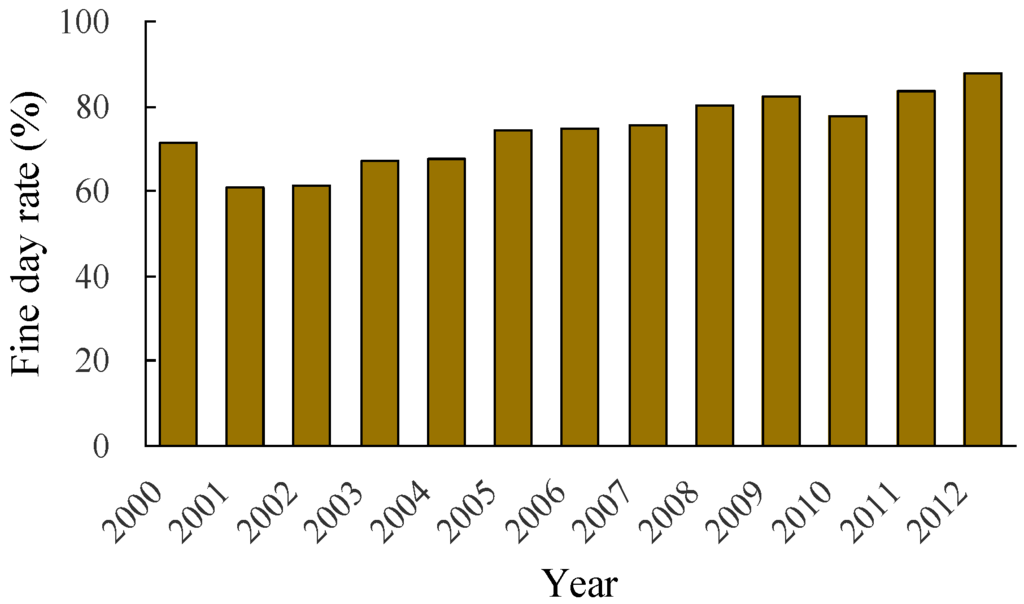 Figure 4 summarizes the percentage of days when the 24h mean concentrations of all criteria pollutants satisfied the national air quality standard. It is clear that the percentage increased slightly over the years until 2012. However, it should be kept in mind that the PM2.5 concentration was not considered before 2012. Immediately after the new air quality standard (GB3096-2012) was put into effect in 2013 and PM2.5 was included in air quality assessment, the percentage of days with good air quality declined abruptly. Although the air quality in Wuhan improved to a certain degree in the last decade in terms of PM10 and SO2, the air pollution problem is still very serious.