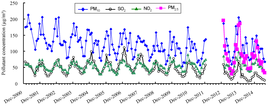 Figure 5 presents the average monthly variations of SO2, NO2, and PM10 during the period of 2001–2014 except for the year 2012. In addition, PM2.5 data from 2013 to 2014 were included. It is observed that the monthly variations of pollutants demonstrated “V”-shape curves, which indicate the low pollution levels in summer and high levels on both sides. The varying patterns of concentrations are almost identical during the same period in each year, i.e., low levels during summer (June, July and August) and high levels in other months. It should be mentioned that the concentrations in September were as low as those in the summer months. September in Wuhan might be regarded as a summer month in terms of the air quality level.