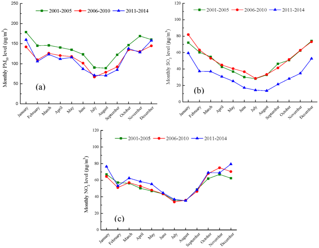 Monthly variation of air pollutant levels of (a) PM10; (b) SO2; (c) NO2.