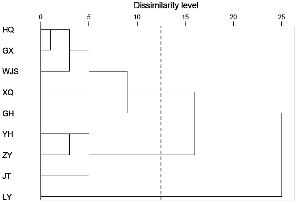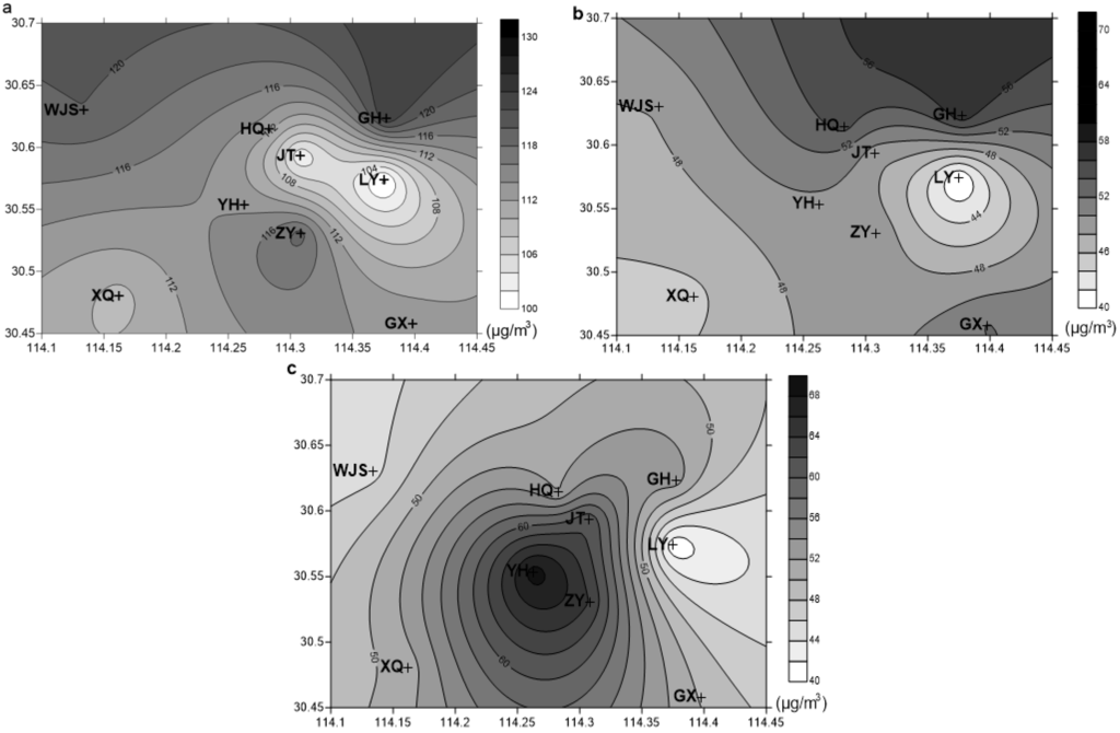 Hierarchical Agglomerative Cluster Analysis (HACA) was carried out on concentration data set of PM10, SO2, and NO2 to identify the spatial variation of nine monitoring stations based on their similarity levels. The dendrograms from the cluster analysis are given in Figure 7. It can be seen that the nine stations were classified into three clusters. Cluster I accommodated only the LY site. Cluster II was formed with the three stations of YH, ZY, and JT, while Cluster III took the remaining five stations of HQ, GX, XQ, WJS, and GH. To further explore the pollution characteristics in each cluster, contours of pollutant concentrations were plotted in Figure 8. It is obvious that the air quality in Cluster I is relatively the best with the lowest PM10, NO2, and SO2 levels. LY station within Cluster I is located in the famous East Lake scenic area, where industrial activity and construction of high-rise buildings are forbidden. The local pollutant sources are scarce and the geometrical layout is favorable for pollutant dispersion.