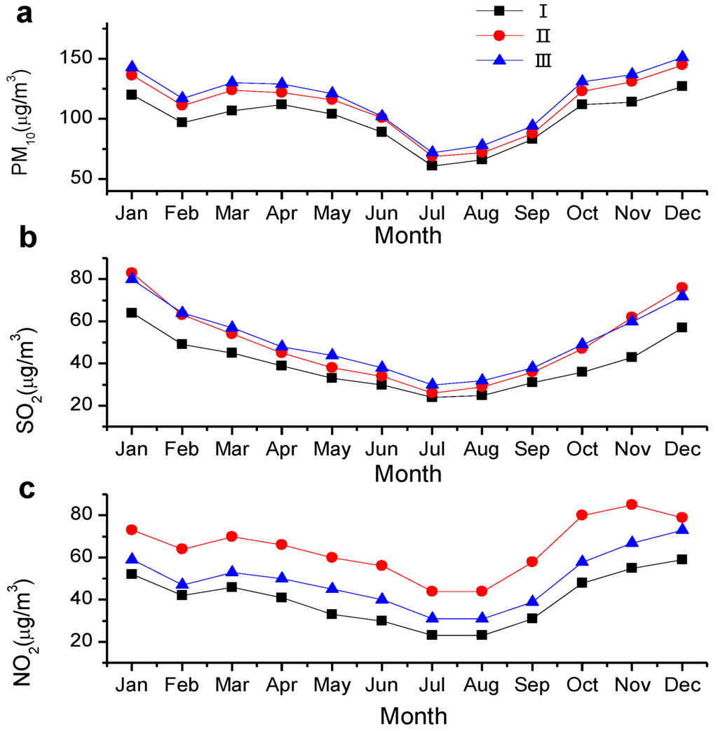 Figure 9 shows the monthly concentrations averaged over those monitoring sites belonging to the same cluster. As expected, Cluster I had the lowest concentrations each month for all three pollutants. The NO2 concentration in Cluster II was the highest, and the highest levels of PM10 and SO2 appeared in Cluster III. The trend is exactly the same as demonstrated in Figure 8, confirming the correctness of the clustering result.