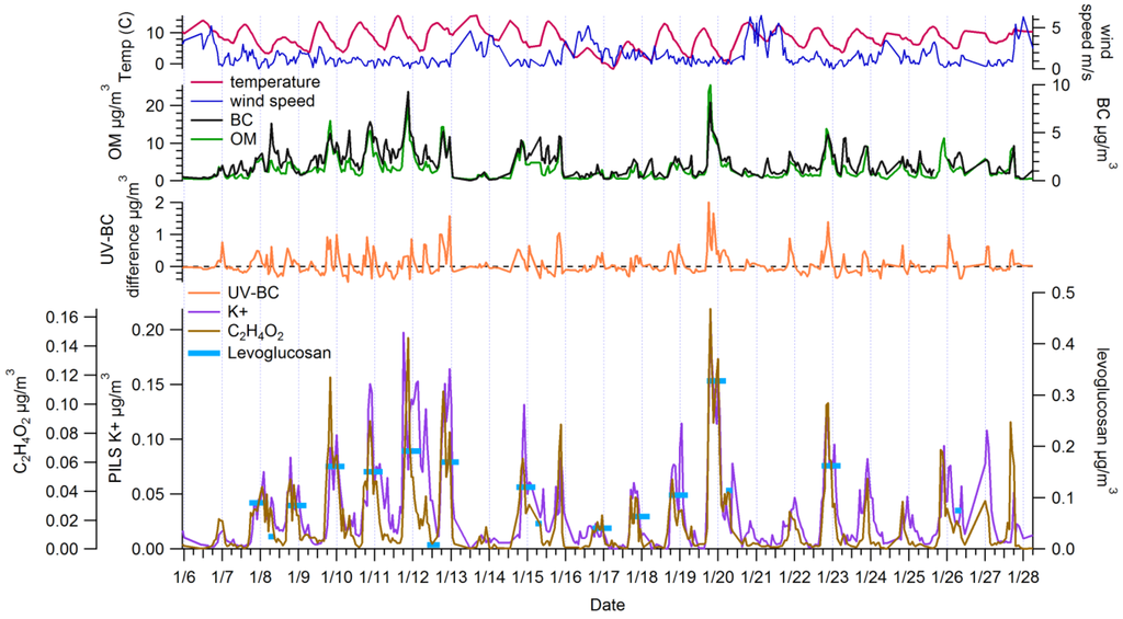 Biomass burning is typically apportioned using: (1) the organic molecule levoglucosan, either via chemical analysis of filters or semi-continuously via instruments such as the Aerodyne High Resolution Aerosol Mass Spectrometer (HR-AMS); (2) potassium; and (3) multi-channel Aethalometer data. Levoglucosan is an anhydrous sugar produced in the combustion of cellulose [12,13,14,15,16]. It is typically quantified by extracting aerosol collected on quartz fiber filters and analyzing the aerosol by gas chromatograph-mass spectrometer (GC-MS) or other analytical techniques. While levoglucosan is a good tracer for biomass burning, Sullivan et al. and others have found that the relationship of levoglucosan to organic aerosol in biomass burning emissions can vary widely by fuel type and burning conditions [16]. Levoglucosan may not be fully conserved during transport due to atmospheric oxidative processes [17,18,19,20,21], so using levoglucosan observations may not capture the complete impact of primary biomass burning smoke emissions at a receptor. Hennigan et al. [17] in a laboratory study, found that under typical summertime OH concentrations, levoglucosan is stable for 0.7–2.2 days. Since our study occurred during wintertime, and the main source of levoglucosan is local biomass burning with little transport time or distance, levoglucosan is likely stable enough here to be used as a robust tracer for primary biomass burning emissions. In addition to being quantified by filter collection, levoglucosan and related compounds also emitted by combustion of cellulose or hemi-cellulose can be quantified on a semi-continuous basis by the HR-AMS, where the ion C2H4O2+ at mass-to-charge ratio (m/z) 60 is commonly used to indicate biomass burning; C2H4O2+ is proportional to the amount of levoglucosan in the sampled aerosol [22,23,24,25]. Levoglucosan is not the only source of this ion, since other organic species such as other anhydrosugars (e.g., mannosan and galactosan) and organic acids also contribute to its mass, but levoglucosan and structurally related molecules in biomass burning smoke typically are the dominant source of C2H4O2+ ion [17,25].