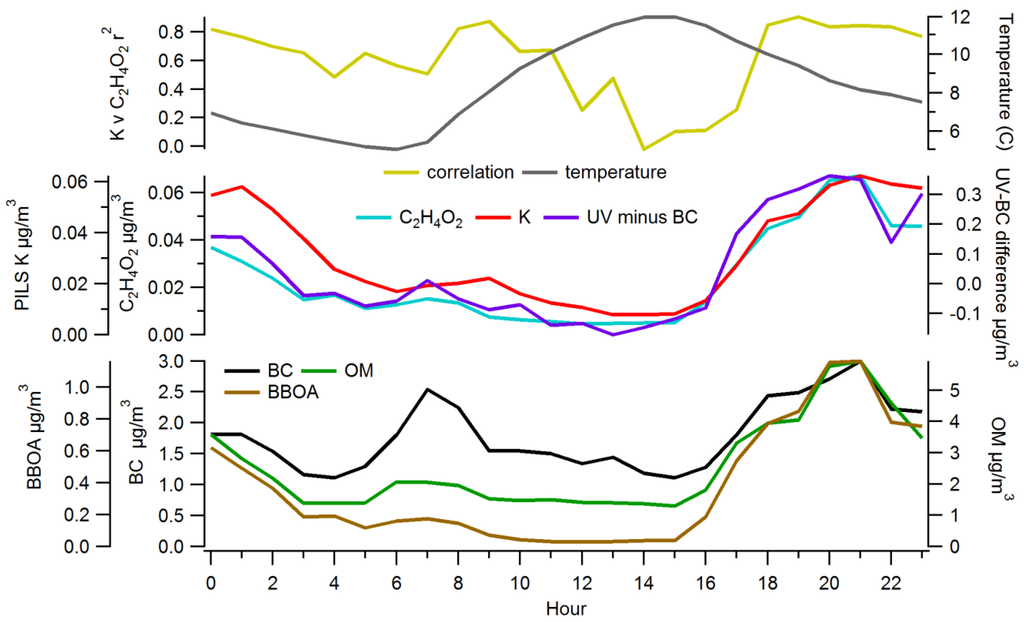 UV-BC difference had only a modest correlation with C2H4O2+ (r2 = 0.43), similar to the correlation between UV-BC difference and levoglucosan (r2 = 0.53). BC and C2H4O2+ have a good correlation during the evening (r2 = 0.80) during the period of strong residential wood combustion, but only a modest correlation in the morning (r2 = 0.35). K+ correlated poorly with both BC and UV-BC difference.